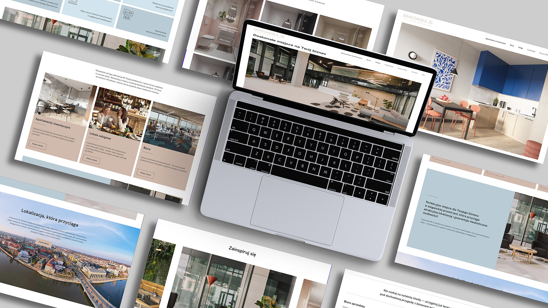 Projekt został zrealizowany jako komplet narzędzi wspierających sprzedaż i wizerunek inwestycji, z zachowaniem spójności wizualnej i klarownego przekazu.