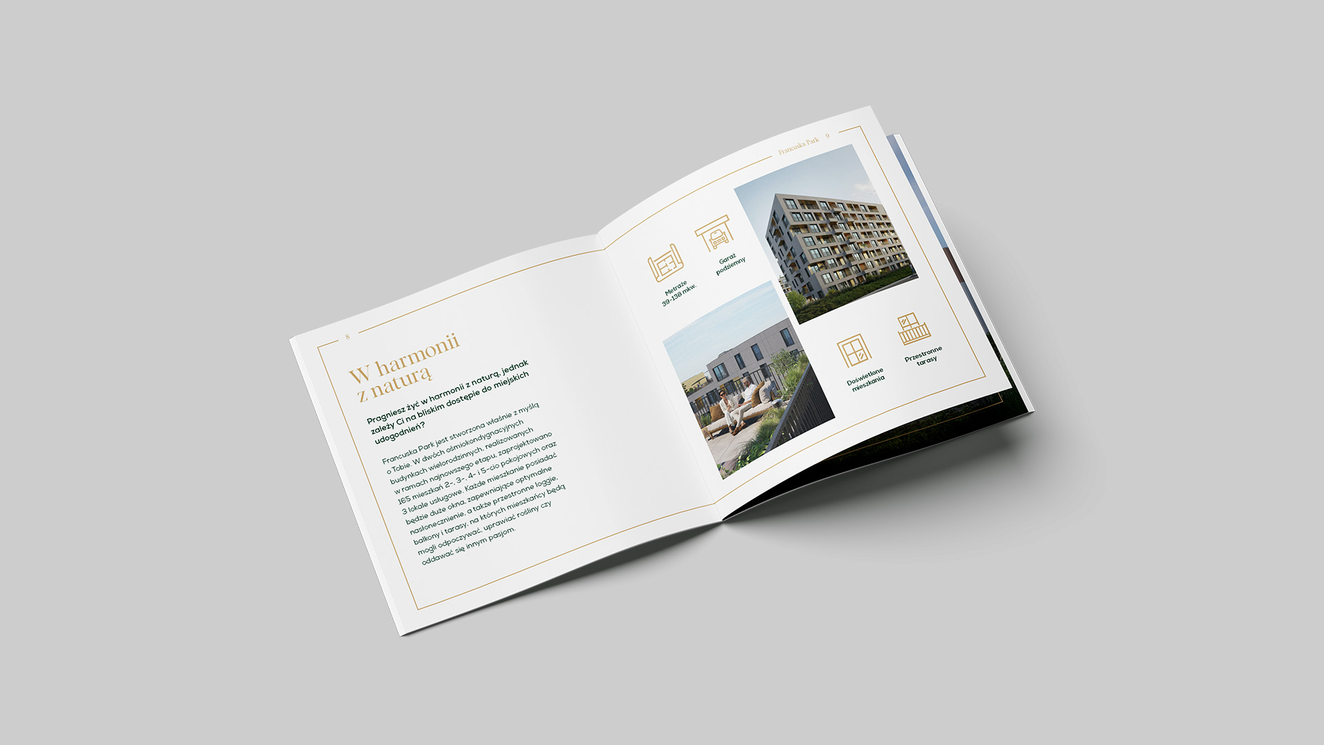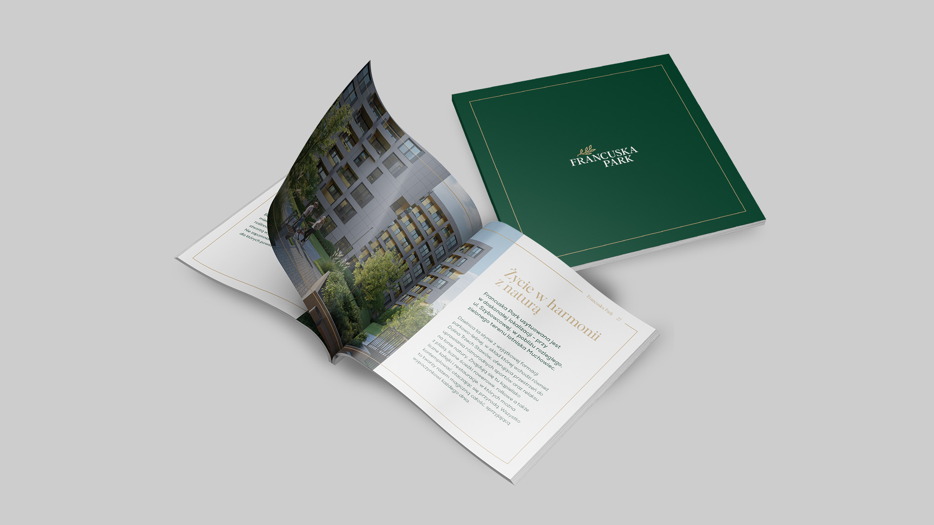 Folder wpisuje się w spójny język wizualny inwestycji Francuska Park, wspierając jej profesjonalny odbiór i komunikację w bezpośrednim kontakcie z klientem.