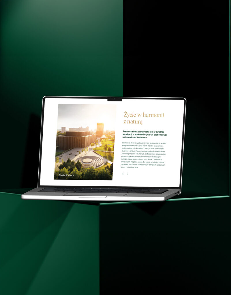 Nowa strona internetowa została zaprojektowana jako bezpośrednia kontynuacja rebrandingu i odświeżonej strategii komunikacji. Postawiliśmy na czystą strukturę, nowoczesną estetykę i intuicyjną nawigację, dzięki czemu serwis jest zarówno estetyczny, jak i funkcjonalny. Priorytetem było wyraźne podkreślenie nowej identyfikacji wizualnej, poprawa doświadczenia użytkownika oraz przejrzysta prezentacja inwestycji.