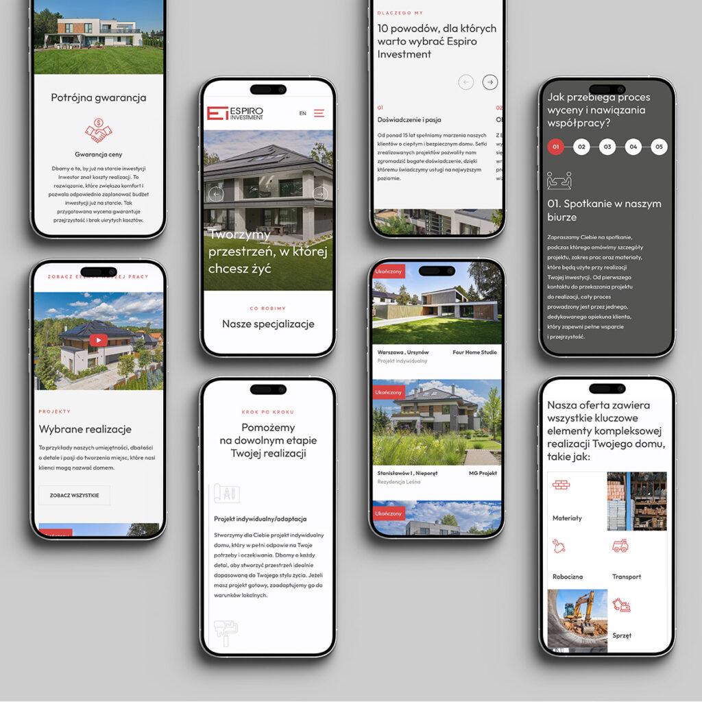 Celem projektu było stworzenie strony internetowej prezentującej kilka obszarów działalności Espiro Investment w sposób czytelny i zrozumiały dla klienta. Kluczowym wyzwaniem było jasne pokazanie etapów współpracy oraz kompleksowego charakteru oferty – od projektu, przez budowę, aż po wykończenie.